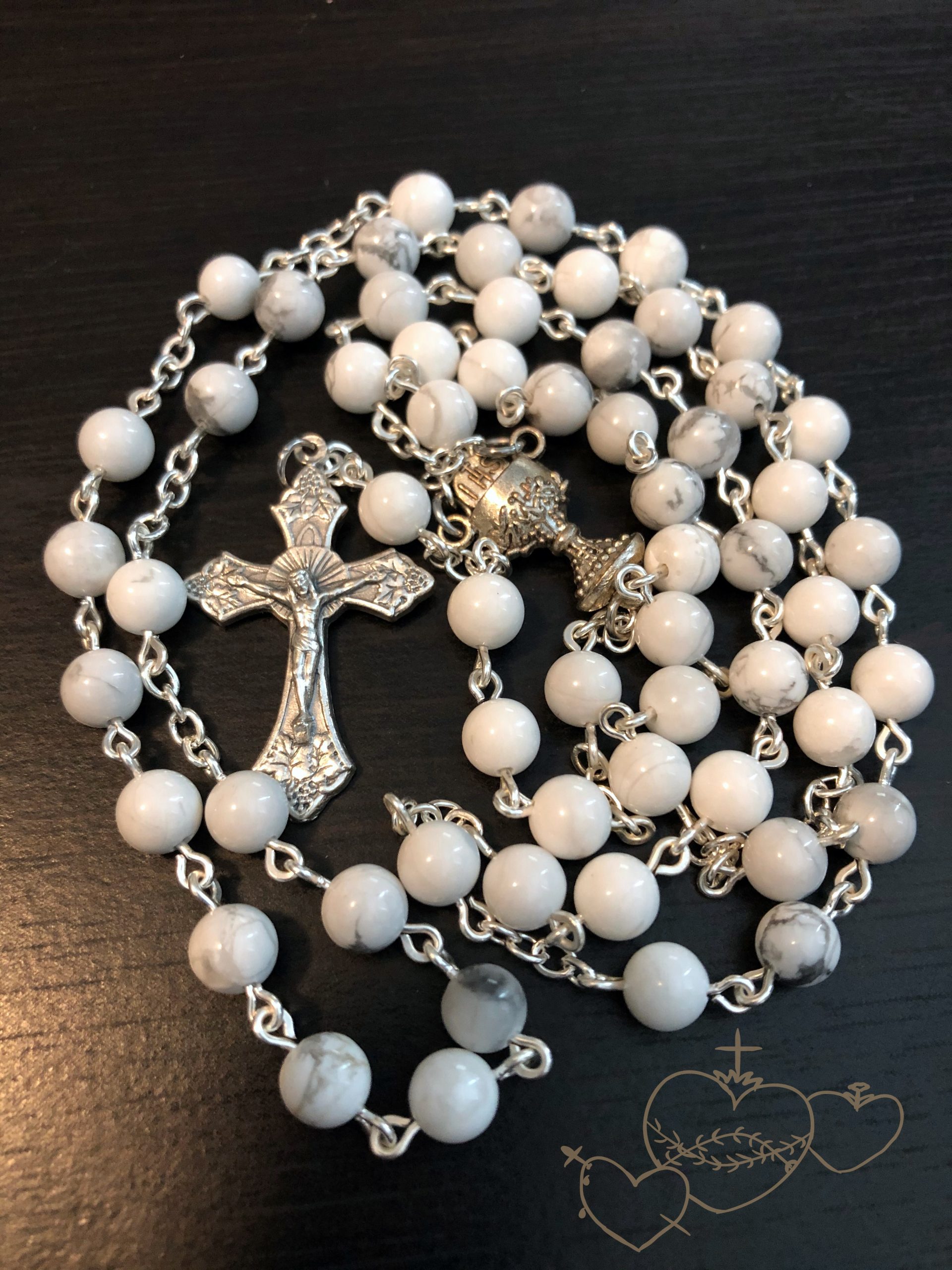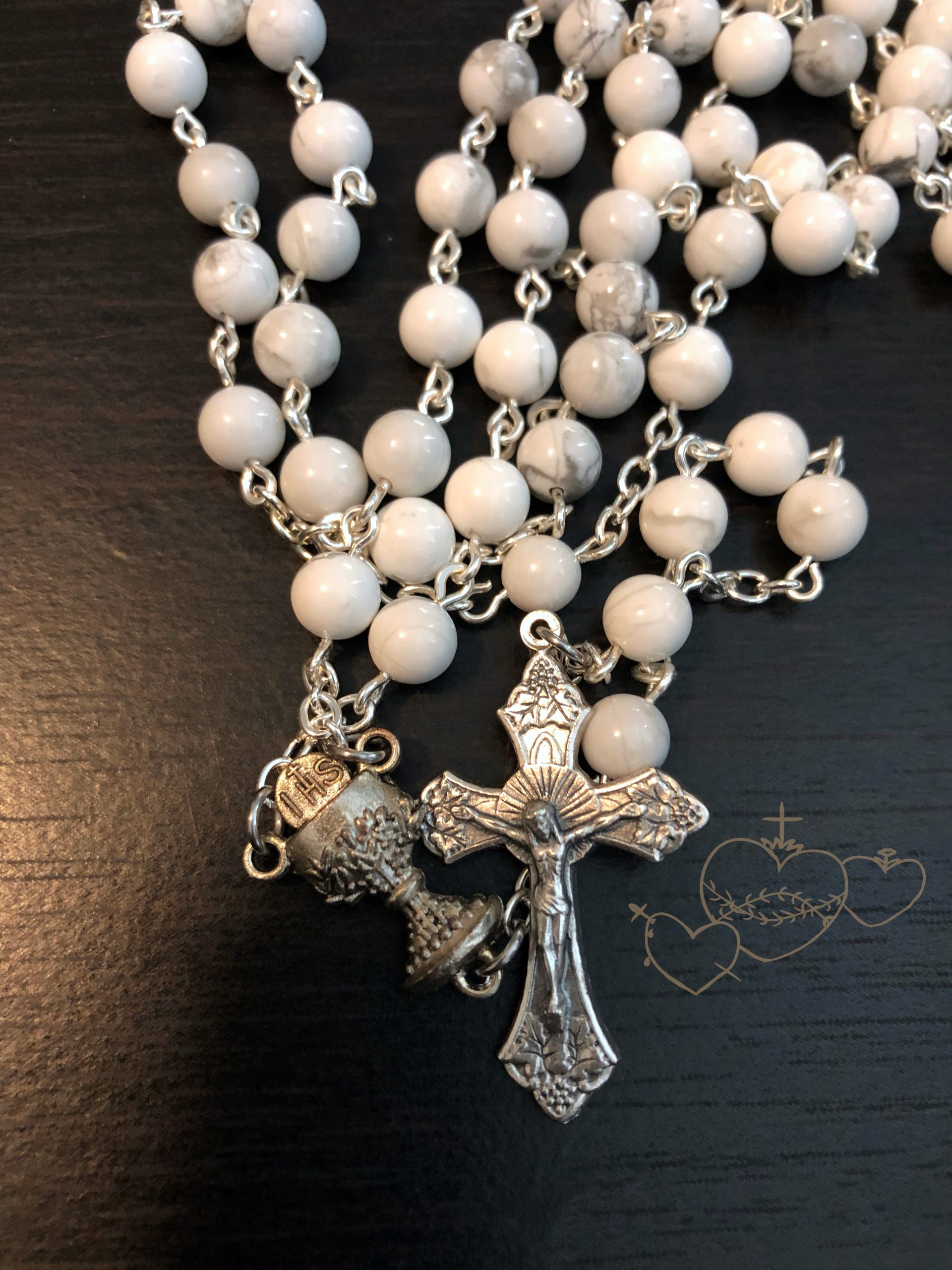 Our First Communion Rosary is a beautiful Rosary with White Howlite Beads.