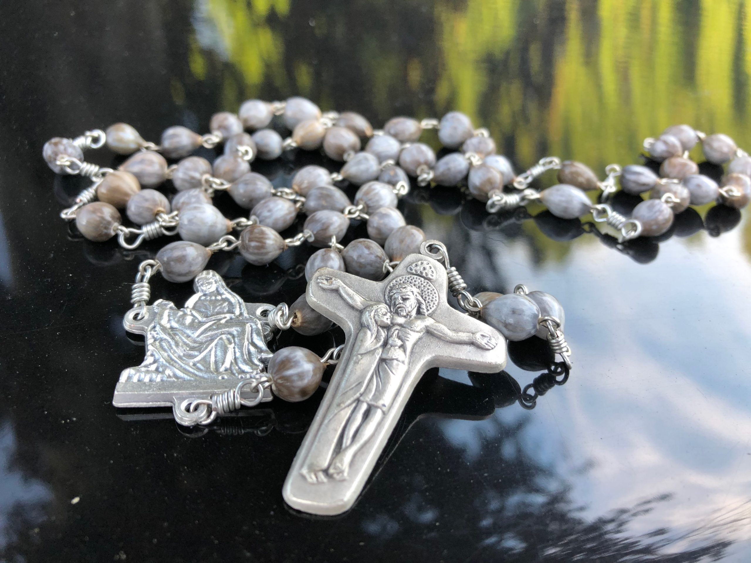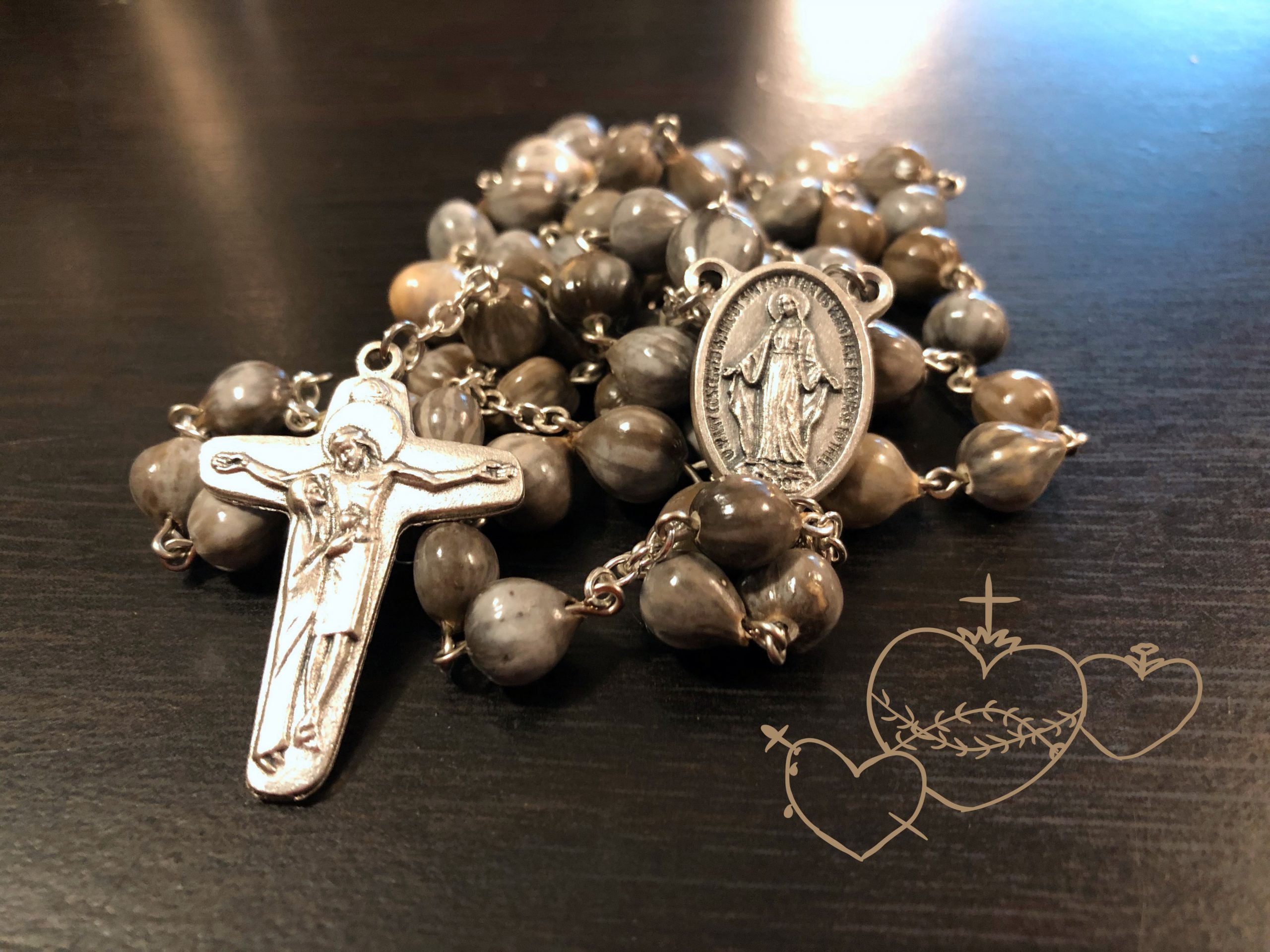 These Rosary Beads are made with beautiful Job’s Tears. Job’s tears are the seeds of a grass like plant that when dried are naturally shiny and have a hole in both ends. This makes them the perfect seeds for making jewelry. They have been used for beads dating back to at least 2,000 BC!