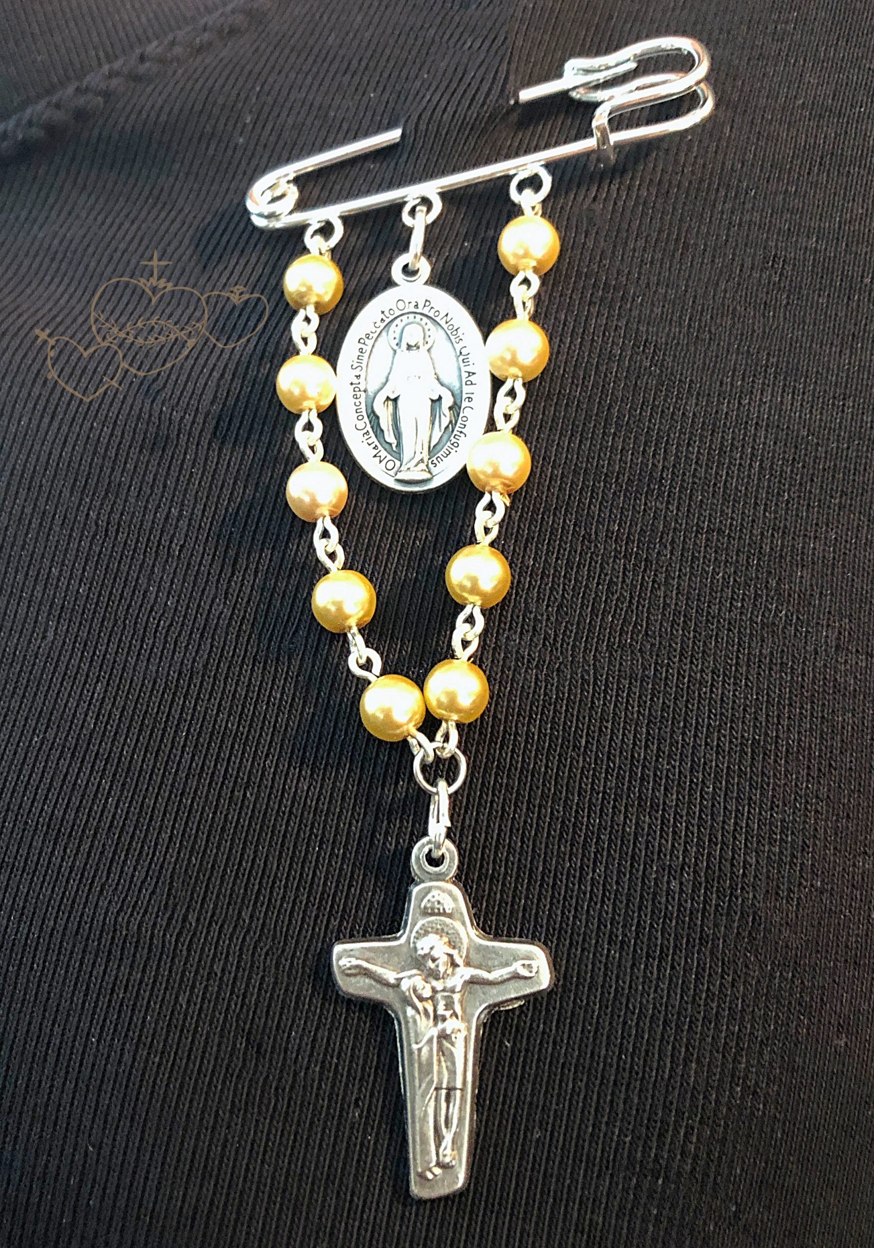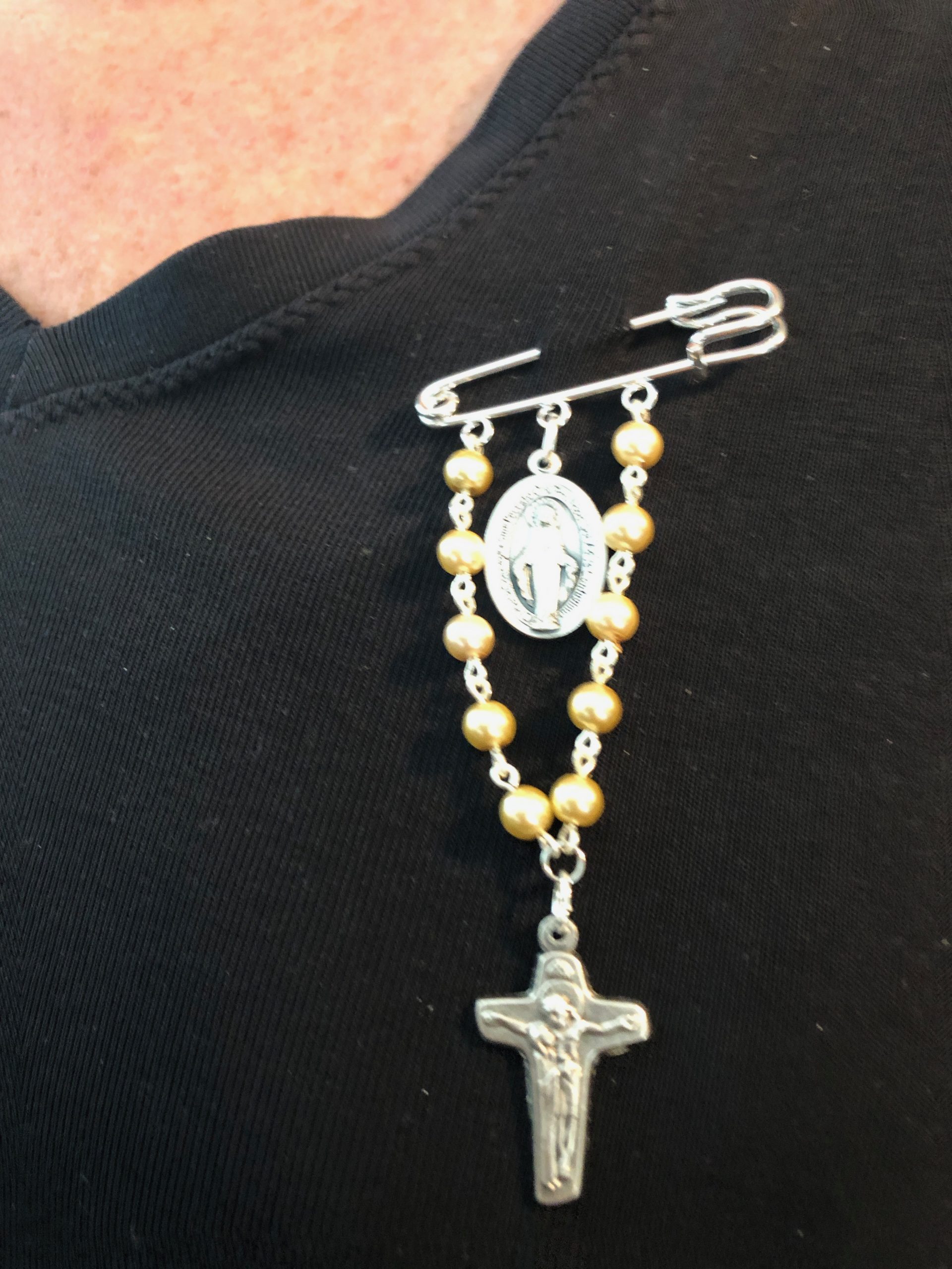 This is a lovely Pearl Rosary Broach. We make this with a beautiful 2 inch Kilt pin A one inch Miraculous Medal A 1 1/4 inch Schoenstatt Crucifix and 6mm crystal pearl beads.